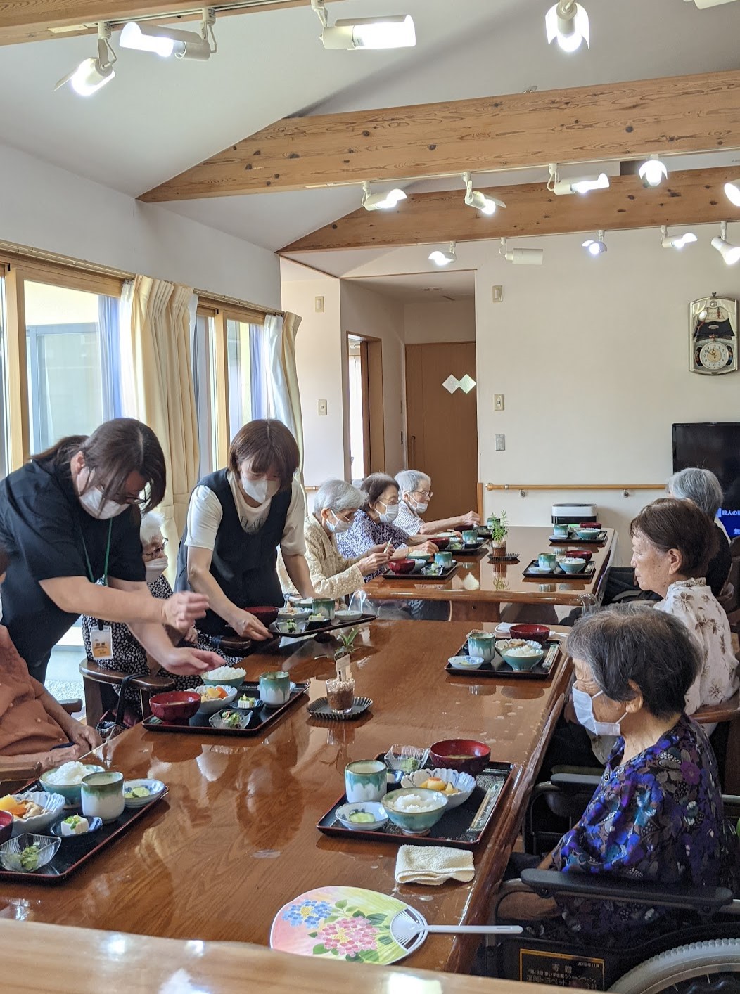 皆さんで食べる昼食は、いつもより食欲も増しスタッフも近くにいるので、ゆったりとした雰囲気の中、安心してお召し上がり頂けます。