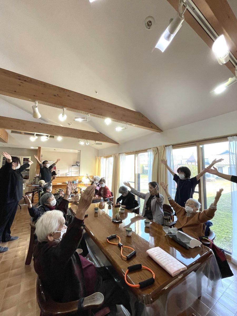 健康体操(ラジオ体操・ゴム体操等)や様々な個別の目的に合わせた機能訓練(ウォーターベッド・ホットパック・滑車等)に加え、環境を活かした自然リハビリ(散歩など)を通じて、ご利用者の方々の健康維持に向けて取り組んでいます。